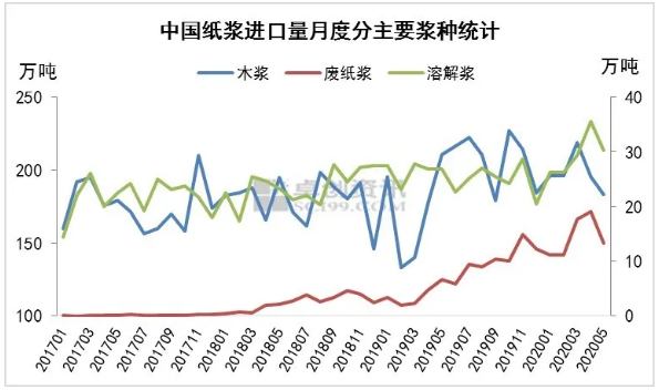 據海關數據顯示,2018年廢紙漿進口量29萬噸,同比增加2371%;2019年進口廢紙漿量91萬噸,同比增加209%;2020年前5個月進口量73萬噸,較2019年前5個月廢紙漿進口量同比增加280%,已經占到2019年總進口量80%,前5個月廢紙漿的進口量占紙漿進口總量的6%,較去年同期占比增加4.09個百分點。預計2020年廢紙漿進口量持續增加,有望增加至200萬噸。