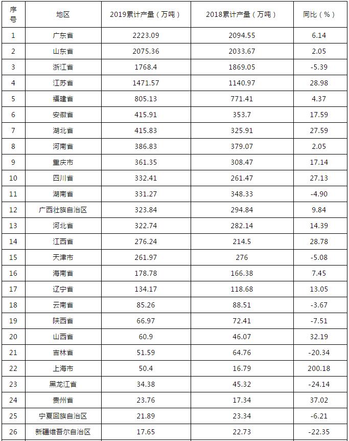 按行政區(qū)域劃分,2019年,廣東省實(shí)現(xiàn)產(chǎn)量2223.09萬噸,同比增長6.14%,排名************,山東省2075.36萬噸,同比增長2.05%,排名第二。產(chǎn)量超過1000萬噸的省份還有浙江和江蘇。四個(gè)省份產(chǎn)量合計(jì)占到全國總產(chǎn)量的60%。增速比較快的省份包括上海、貴州、山西、江西、湖北、江蘇和四川。